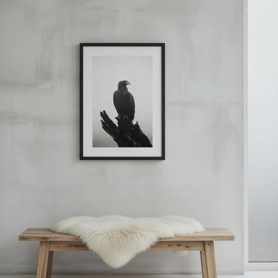 "Apex" captures an eagle perched atop the jagged remains of an ancient tree, surveying its domain with piercing intensity. The stark contrast between the dark plumage and the pale mist creates a striking portrait of dominance and stillness—a predator at rest, yet always watchful. This is nature's ultimate authority rendered in monochrome, where every feather and every shadow speaks to the quiet confidence of the apex predator. A commanding piece that brings gravitas to any space.