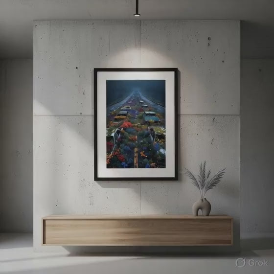 This museum-grade print is the visual heartbeat of the "escape." It captures a world where the noise of society has finally fallen silent, replaced by an explosion of untamed, vibrant life. The Flourishing Void transforms a deserted highway into a sanctuary, using high-contrast textures and saturated florals to prove that peace can be found even in the most unexpected places.