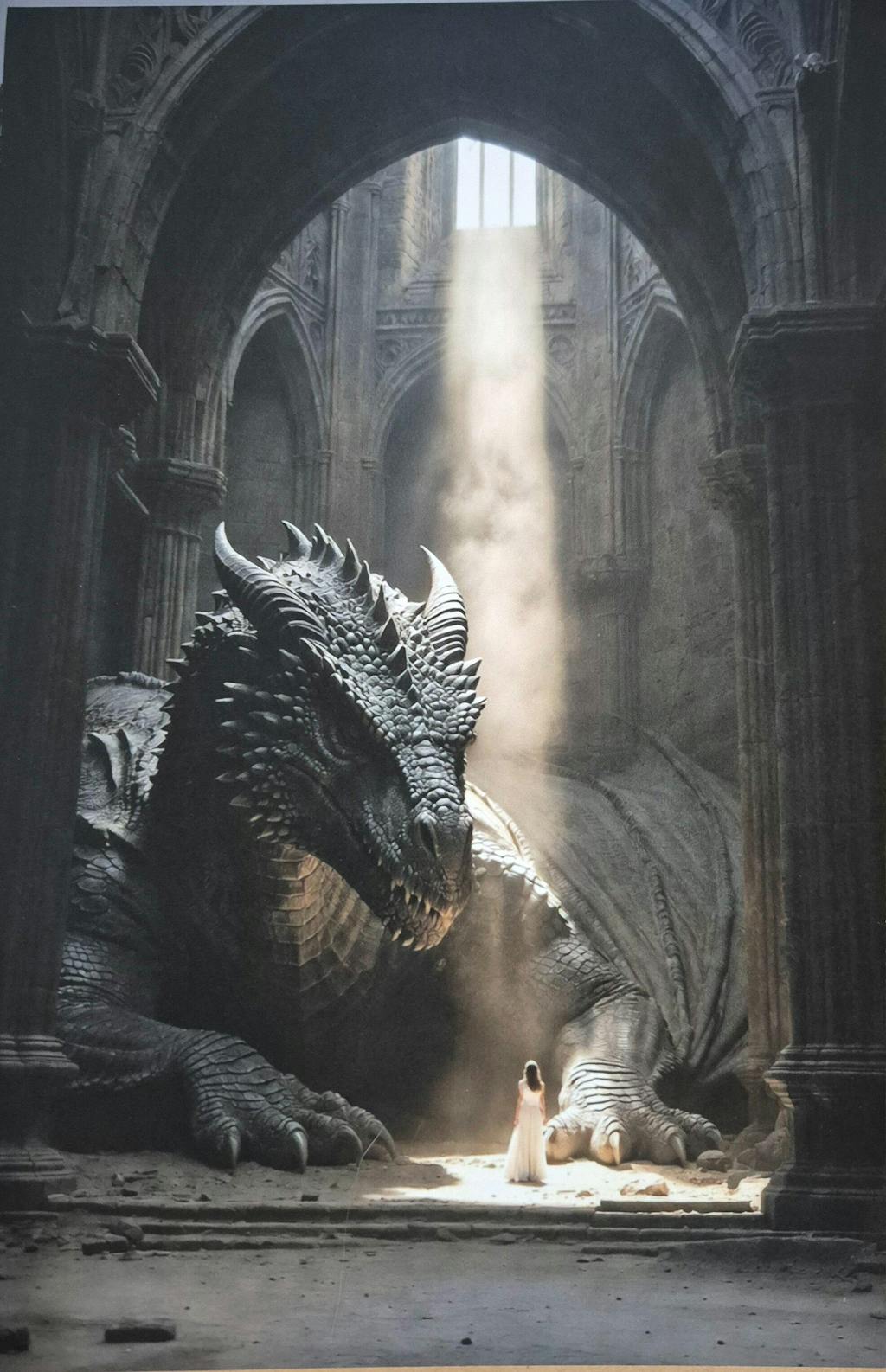 "The Sentinel" captures the breath-holding moment of discovery. Deep within a colossal stone hall, an ancient dragon rests in the shadows, his massive head lowered toward a figure standing in a single shaft of dusty light. This is the quietest yet most powerful image in the collection. The play of light and shadow creates an immense sense of scale—the dragon feels heavy, ancient, and real, while the light feels fragile and holy.
